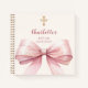 A cream, beige background colour. Decorated with a large pink bow and a golden cross.  Personalise and add the name and date.