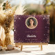 Burgundy gradient background decorated with faux gold diamond photo frame. Faux rose gold glitter. Personalise and your photo, name and date. Rose gold foil text.