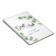 A white background colour. Decorated with elegant eucalyptus greenery sprigs.  Add a name and a date.