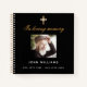 A guest book for a memorial service or funeral. A classic black background, a faux gold cross on the front. Personalise and add a photo, name and dates.