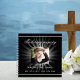 A guest book for a memorial service or funeral. A classic black background, a faux silver frame on the front. Star rays behind the photo. Personalise and add a photo, name and dates.