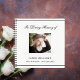 A guest book for a memorial service or funeral. A white background, a black frame on the front. Personalise and add a photo, name and dates. Black text.