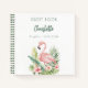 A stylish white background decorated with a pink flamingo and tropical flowers and foliage. Personalise and add a name and year.