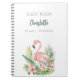 A stylish white background decorated with a pink flamingo and tropical flowers and foliage. Personalise and add a name and year.
