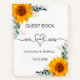 A white background colour. Decorated with sunflowers, eucalyptus greenery and golden foliage. Add your names and wedding date. Mr Mrs and a heart written with a modern hand lettered style scrupt.