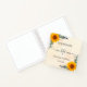 Golden watercolored brush strokes as background. Decorated with sunflowers, eucalyptus greenery and golden foliage. Add your names and wedding date. Mr Mrs and a heart written with a modern hand lettered style scrupt.