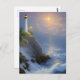 Beautiful and scenic AI generated digital art postcard features "the guiding light" a glowing white lighthouse on a cliff with crashing waves below.