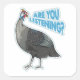 A funny cartoon-style illustration of a noisy guineafowl with the text are you listening? Guineafowls are known for being very loud.