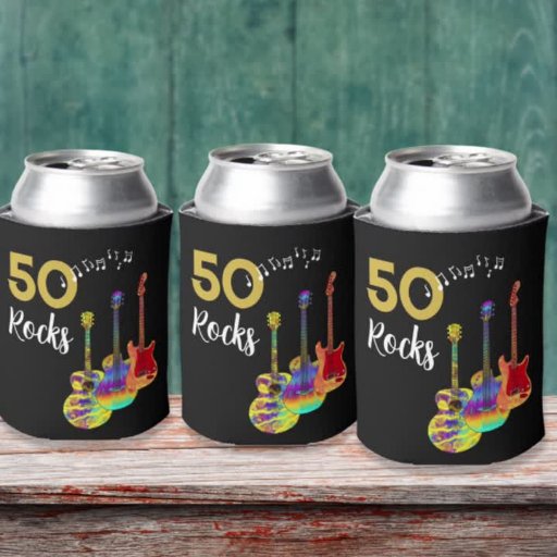 50 Rocks 50th birthday party wine labels with three cool watercolor guitar designs on black background. An electric guitar with Fire flame pattern and red pick guard, a multicolored semi acoustic guitar and a psychedelic classic acoustic guitar art illustration with personalised black and gold modern cool typography. This easy to use template to change the age creates the perfect party decor to celebrate fifty in rock n roll style and is ideal for a guitarist, musician and music lovers. Any guitar player will tell you that you can never have too many guitars. This cool modern musical instrument design celebrates the music energy of this wonderful musical instrument and is the perfect way to rock a fiftieth birthday celebration. Original artwork by artist Catherine Sweetman