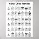 This guitar chord families poster is a great reference with chord diagrams for chords in the following chord families: C, D, F, G, A, B♭. Perfect for both new beginner guitar players and intermediate guitar players. This poster features a black and white colour scheme and a nice classic font with customisable colours for every element (text, dots, and fret lines). This is a clean and simple reference poster to learn your guitar chords and decorate your rooms.