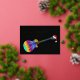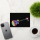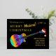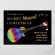 Bring some festive guitar music cheer to the christmas season with this fun merry musical christmas modern black and gold foil holiday card. Funny hand drawn bright rainbow colours semi acoustic electric guitar wearing a Santa hat illustration with gold foil musical notes and typography script all easy to personalise with the template. Ideal for music loving families to send seasons greetings and for guitar players, music teachers and musicians. Original artwork by Catherine Sweetman