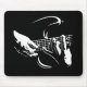 Highlighted close-up of a guitarist's playing hands. B/W, line drawing.