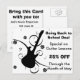 Bring in more customers with this "guitar lessons deal" postcard. Change any of the text, we just put example text. Change the text to your needs on the front and the back of this card in the customise area. A great way to advertise business and remind your clients to sign up for guitar lessons with you!