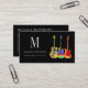 Modern guitar music teacher custom qr code business card. This vibrant business card features psychedelic acoustic, semi-acoustic, and electric guitars in a dazzling array of colours against a striking black background. Complete with a personalised monogram, your name, contact details in stylish typography and a convenient website QR code, all rendered in stylish typography, this card is the perfect cool and colourful introduction for guitar teachers, guitarists, professional musicians, entertainers, and music teachers. Original artwork by artist Catherine Sweetman.