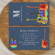 Modern guitar music teacher personalised monogram business card. Unique artwork with psychedelic colourful funky acoustic guitar, semi acoustic guitar and electric guitar in bright colours on a blue background complete with custom monogram, name and contact details including website and email. The perfect cool colourful business card design for guitarists, professional musicians, entertainers and music teachers. Original artwork by artist Catherine Sweetman
