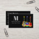 Make a lasting impression with these vibrant business cards designed for guitar teacher musicians. Featuring a psychedelic array of acoustic, semi-acoustic, and electric guitars against a striking black background, this design by artist Catherine Sweetman is guaranteed to catch the eye. More than just visually appealing, these cards offer essential functionality, Easily personalise it with your monogram, contact details, website QR code, and social media links.