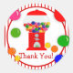 These fun and festive round stickers make a great goody bag thank you sticker for children's birthday parties! Design features a red ans white stripe background. In the centre is a white circle with red trim. Inside the circle is a red gumball machine filled with colourful gumballs in red, blue, green, yellow, orange, pink and purple. Surround the gumball machine are gumballs in various sizes and colours. Below the gumball machine is text in red font that says Thank You!, however this text can bu customised to suit your needs. These stickers match our Gumball Machine Children's Birthday Party Invitations, party favour buttons, envelopes and acrylic cake topper decoration.