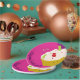 Paper plate with a smiling gummy bear cupcake. This design has a pink and purple background. This item shows the words Happy Birthday and a customisable name.