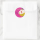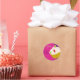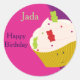 Sticker with a smiling gummy bear cupcake. This design has a pink and purple background. This item shows the words Happy Birthday and a customisable name.