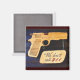 This wood gun has the humourous saying 'we don't call 911' , with a wood grain background all displayed in brown earth tones that highlight the quote. Cute patriotism for kitchen and entry way magnets.