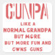 A retro-style t-shirt design featuring the phrase "Gunpa: Like a normal grandpa but more fun and owns guns," with a vintage colour palette and classic font, evoking a playful yet bold vibe.
