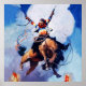 Newell Convers Wyeth was one of America’s early western illustrators. His early trips to the frontier inspired the image of the ‘wild west’. This painting is called “Guns Abazing” and depicts a cowboy riding a bucking bronc with guns blasting and firecrackers exploding.