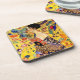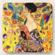 Coasters featuring Gustav Klimt’s oil painting Lady with Fan (1918). A woman wearing a blue kimono holds a red fan against a colourful yellow background of flowers and peacocks. A great gift for fans of Japonisme and European art.