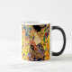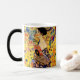 Magic Mug featuring Gustav Klimt’s oil painting Lady with Fan (1918). A woman wearing a blue kimono holds a red fan against a colourful yellow background of flowers and peacocks. A great gift for fans of Japonisme and European art.