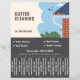 A flyer with tear off strips featuring an illustration of a roof and gutter of a house and some fall leaves, on behind a blue sky, with a cloud. It could be used for small business such as roof and gutter cleaning or repair, moss removal, handyman, pressure washing service, etc.