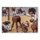 Vintage artwork showing young fogs wearing clothes practicing various gymnastics. An older dog wearing clothes is obviously their teacher