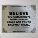 The exercise quote reads: BELIEVE YOU CAN ACHIEVE YOUR FITNESS GOALS AND YOU'RE HALFWAY THERE. ~ Felicity Luckey
