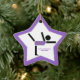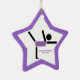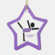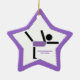 Gymnastics gifts, gymnastics performer ceramic ornament in star shape showcasing a minimalist black icon of a gymnast wearing a purple leotard with a purple border around.