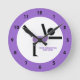 Gymnastics gifts, gymnastics performer custom gwall clock that displays a minimalist black icon of a gymnast wearing a purple leotard with a purple border around. Personalise it and change text with monogram, name or your message. The perfect gift ideas for the gymnastics athlete, lover or those who do it as a hobby.