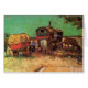 Encampment of Gypsies with Caravans by Vincent van Gogh is a vintage fine art post impressionism daily life travel and transportation painting featuring a group of gypsies with their wagons. The horses and oxen are resting and eating underneath the trees in a field or meadow.