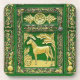 Photograph of a traditional gypsy caravan painted wagon detail with a gold horse on a green painted background, photographed at Appleby horse fair, in Cumbria, England, where gypsies gather every year.