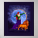 The red haired gypsy witch stands with her magical lion as she uses the crescent moon to shoot stars into the sparkling sky.