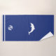 A dark blue towel with a white dolphion and logo of h2g2.com - everything you need on a trip around the galaxy.