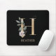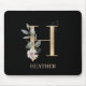 Letter H monogram floral. Letter H in golden brown texture accented with green watercolor compound leaves, flower blossoms and gold dust. Personalised with name in matching font.