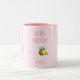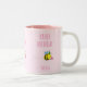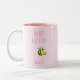 Beautiful hand painted ha bee birthday mug, featuring a bumble holding a pink birthday cake.