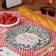 Old Hacienda style is modern and new! Hand painted black and white tile patterns are arranged in a fresh patchwork style pattern of scrolls, diamonds and swirls paired with a soft blush pink. Mix and match patterns are available for a truly custom event decor. Art copyright, Audrey Jeanne Roberts.