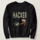Hacker design features large wording above cool graphic of a hacker breaking into a computer system to establish the truth behind the green screen graphics. For hackers, coders and cyber criminals who need to dive deep.