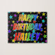 This exciting and vibrant birthday-themed jigsaw puzzle design has the message "HAPPY BIRTHDAY, HAILEY" with the characters having a colourful rainbow spectrum inspired gradient pattern, along with a lively star field background pattern. An exciting puzzle like this might be used to send birthday wishes to somebody named Hailey. [~Z0000468]
