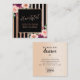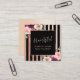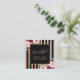 Design features burgundy and pink flowers over greenery leaves, a black centre outlined in a double rose gold glitter frame and a black and rose gold striped background. The back of the card features a simple light rose gold background.