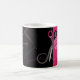 Personalise your own hair stylist mug with your name- The design features a pair of scissors with a black and pink background. - Artwork by ChanDraws Art & Design