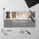 Stylish desk mat has top photographic border of hair stylist tools of the trade with medium grey text area and white modern fonts.