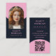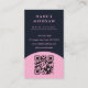 Modern hairstylist business card with elegant arch photo design, trendy pink and navy colour palette, and a scannable QR code for quick access to your website or booking page. Perfect for hairdressers, salons, barbers, and beauty professionals looking to showcase their brand in style. Personalise with your name, and contact details for a professional, unique touch.