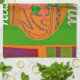 This stylised piece features a bright green giraffe head and neck centrally positioned against a large, decorated orange African pot. An orange shape resembling an elephant's trunk extends from the right side, adding an element of fun and surprise. The background is divided into rectangles of orange, purple, and green, creating a lively patchwork effect. The phrase "HAKUNA MATATA" is prominently displayed in a stylised font, with "Hakuna" above the giraffe's head and "Matata" below.
