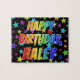 This exciting and vibrant birthday-themed jigsaw puzzle design features the message "HAPPY BIRTHDAY, HALEY" with the characters having a colorful rainbow spectrum inspired gradient pattern, in addition to a fun star shapes background pattern. A colorful puzzle like this might be used to send birthday greetings to somebody named Haley. [~Z0000468]