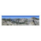 Panorama of Half Dome and Yosemite Valley from Quarter Domes. Half Dome at left, Yosemite valley behind and below it with squarish cornered El Capitan on the horizon. Across the Valley from Half Dome and slightly farther back is the gently rounded bald hump of North Dome, with Basket Dome half in shadow to it's right. The large granite mass of Mt Watkins is at centre with Snow Creek Falls/trail to it's left. Tenaya Canyon runs centre to left from the top end of Yosemite Valley below Half Dome, and Clouds Rest is the highest at far right. California, Sierra Nevada mountains, Yosemite National Park, Yosemite Valley. Off the John Muir Trail near Mile 007.