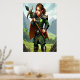 A female Halfling warrior in green armour in the forest with mountain in the background. This is a AI generated art.